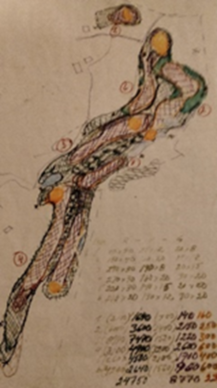 Oheinen kuva on vuodelta 2006 ja ensimmäisiä suunnitelmia väylistä. Kuvaan oli myös laskettu arviot väylien ja griinien pinta-aloista. Valitettavasti griineistä ehti tulla pienempiä, ennen kuin ehdin oikaisemaan. Vain griinin 3 osalta hiekkakerrosta ohennettiin.