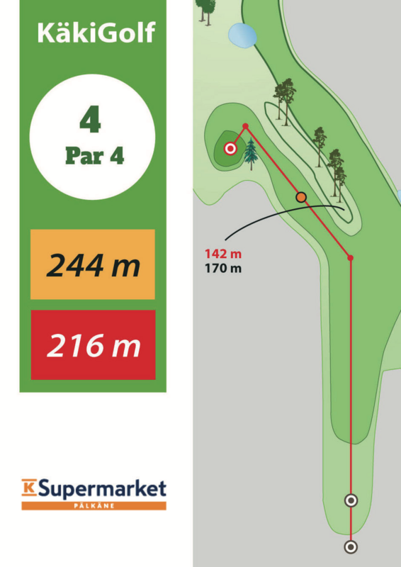 Paikallisvinkki: Tällekkin väylälle on haudattu monta sankariviittaa. Mahdollisimman suora avaus puoleen väliin ja toinen veto tarkasti harkiten tilanteen mukaan. 140 metrin lyönti kärkimäntyä kohti jättää pienen raon tavoitella viheriön oikeaa kulmaa. Tuota lyhyempi veto edellyttää nöyrää pelaamista viheriön oikealle puolelle ja chippi-putti parin tavoittelua. Jos olet tarkkalyöntinen, riskillä pelaten 160-170m avauslyönti kärkimännyn oikealle puolelle jättää raon pomputtaa matala lyönti viheriölle puiden oksien alapuolelta. Katso väyläkartasta pituudet esteisiin.