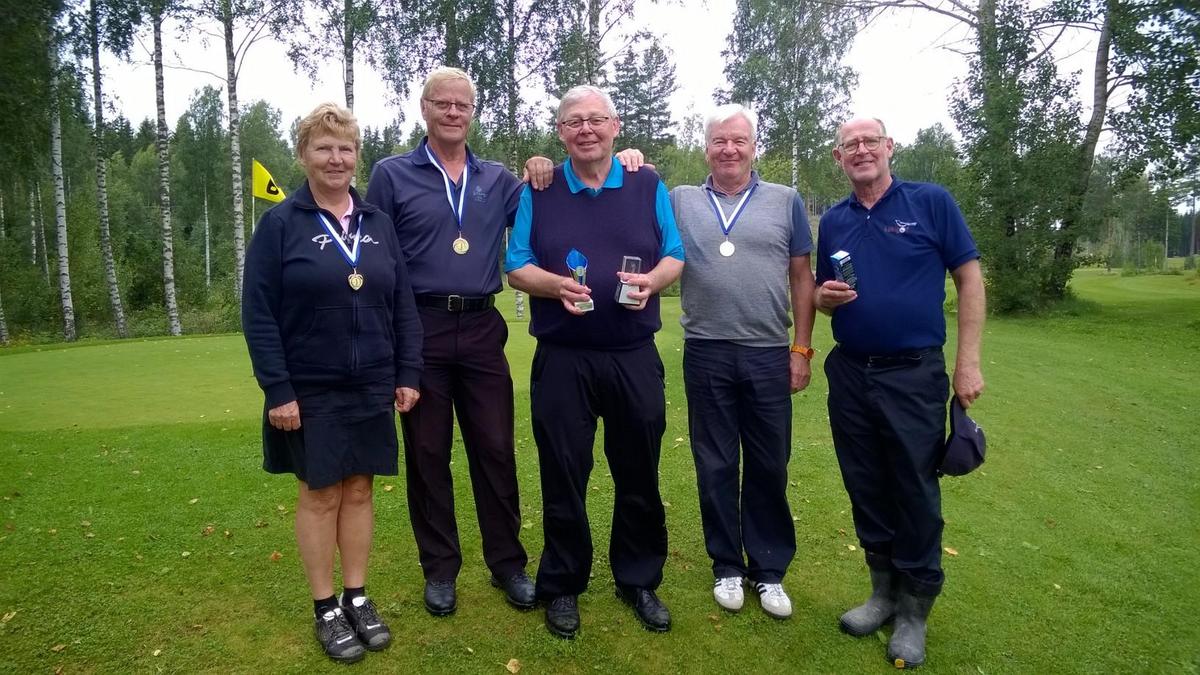 Kuvassa palkintojen saajat: Marjatta, Hannu, Heikki, Risto ja Matti